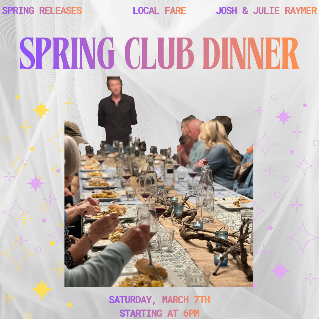 the tasting room. Our Supper Club aims to represent what Lewis Wines is all about: laid back but high quality and an affordable good time. Our Spring Supper Club will consist of a three course, locally sourced meal paired with spring wines. We release this dinner to our Wine Club members first,